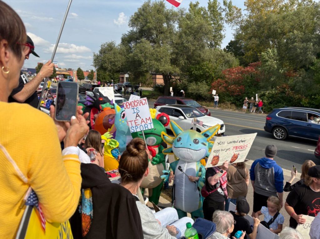 When the van carrying me and a select few other student volunteers neared Drake Road, you could already see the protestors from a distance. As we turned left heading southbound, trying desperately to find parking, the scene in front of me was awe-inspiring. Both sides of the street were lined with people, everyone holding signs, chanting, and showing support for democracy in every way they knew how to. There were costumed characters running about, in a clear pastiche of scenes from Portland, Oregon the weeks prior. For the two hours that the protest lasted, there was near constant honking of horns from passers-by in their cars. Some cars were even covered with slogans and reclaimed American flags, while other people drove by slowly with their passengers holding up signs.